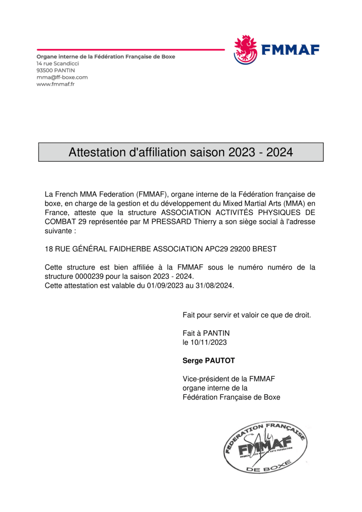 - FMMAF, French Mixed Martial Art Federation, la Fédération Française de MMA – Arts Martiaux Mixtes, sous la tutelle de la FFB (Fédération Française de Boxe).